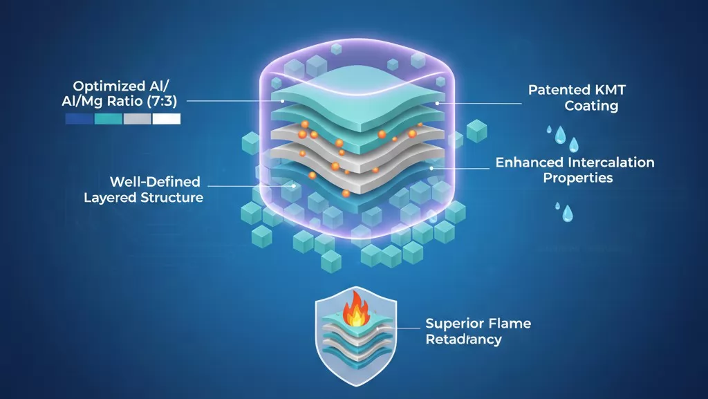 AM3V leverages KMT Industrial's proprietary co-precipitation technology, a sophisticated synthesis process that enables nanoscale synergy between magnesium and aluminum hydroxide layers. This innovative approach creates a uniquely structured layered double hydroxide with exceptional flame retardant properties that far exceed traditional micron-level physical blends.